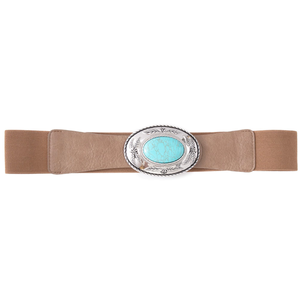Cinto elástico com fivela de design western, pedra turquesa central, unindo conforto e elegância rústica com toque cowgirl americana.